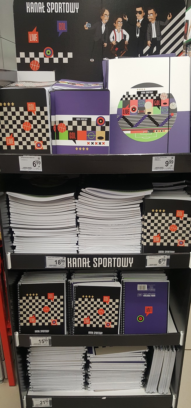 Produktu od Kanału Sportowego są sprzedawane w sportowym sklepie internetowym R-goal, a także w niektórych stacjonarnych sieciach handlowych, m.in. Carrefour. Na R-goal 60-kartkowy zeszyt A5 kosztuje 5,99 zł, teczka – 8,99 zł, a 80-kartkowy kołozeszyt A4 – 14,99 zł. W Carrefourze ceny są wyższe o kilka złotych.