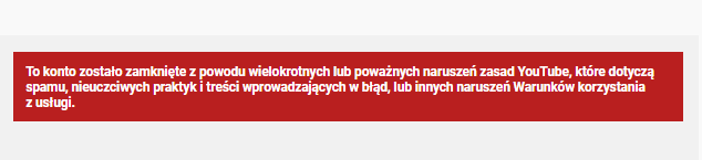 „To konto zostało zamknięte z powodu wielokrotnych lub poważnych naruszeń zasad YouTube, które dotyczą spamu, nieuczciwych praktyk i treści wprowadzających w błąd, lub innych naruszeń Warunków korzystania z usługi.” — tak brzmi oficjalny komunikat, który pojawia się zamiast filmów.