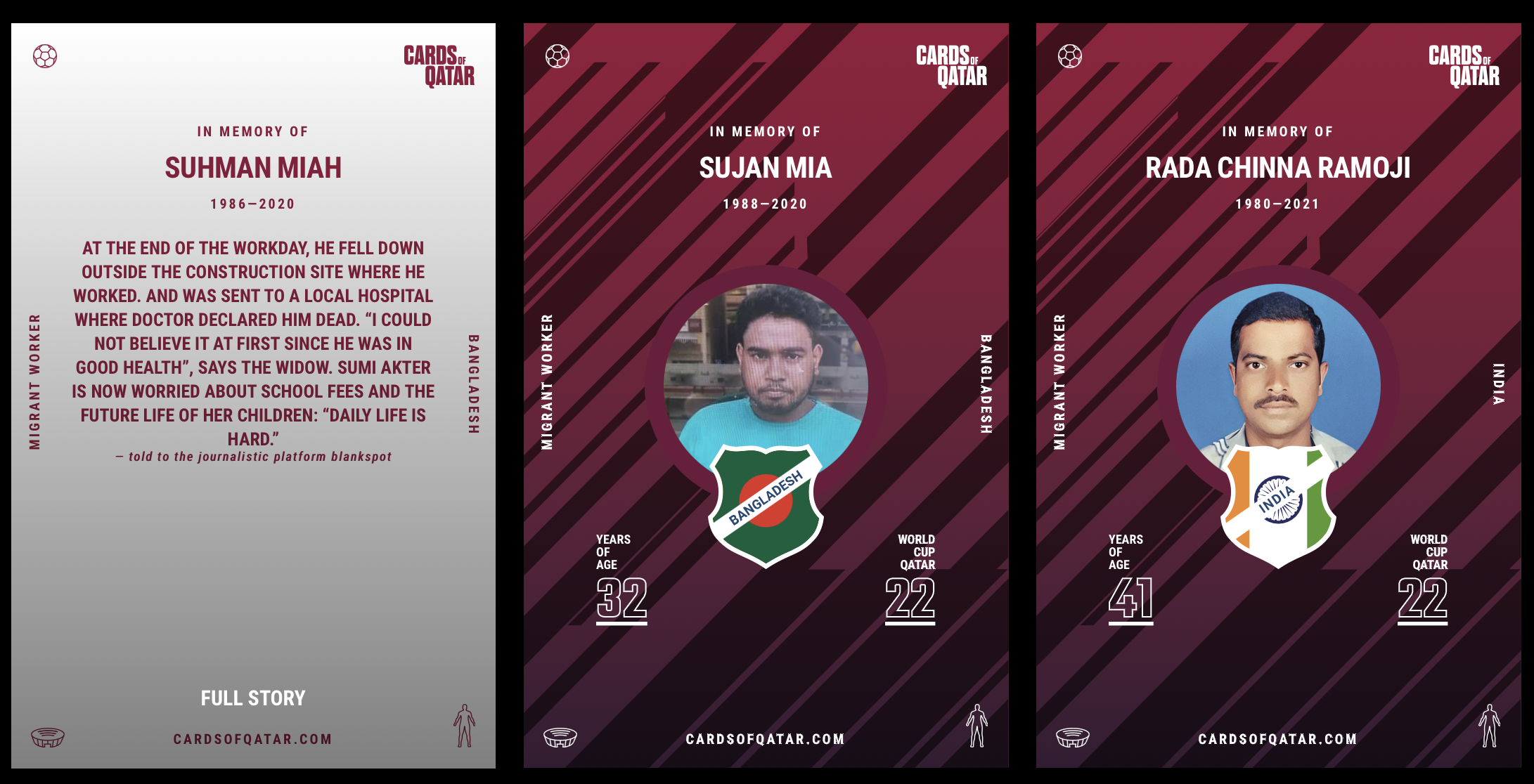 „Cards of Qatar”, czyli „Karty Kataru”, zostały stworzone na podobieństwo pamiątkowych kart piłkarskich, którymi można grać lub po prostu je kolekcjonować. Jednak tym razem zamiast twarzy gwiazd futbolu, znalazły się na nich ranni i zmarli budowlańcy. Każda z kart przedstawia sylwetkę innego pracownika – po jednej stronie znalazło się tradycyjnie zdjęcie, a po drugiej przeczytamy historię każdego z nich.
