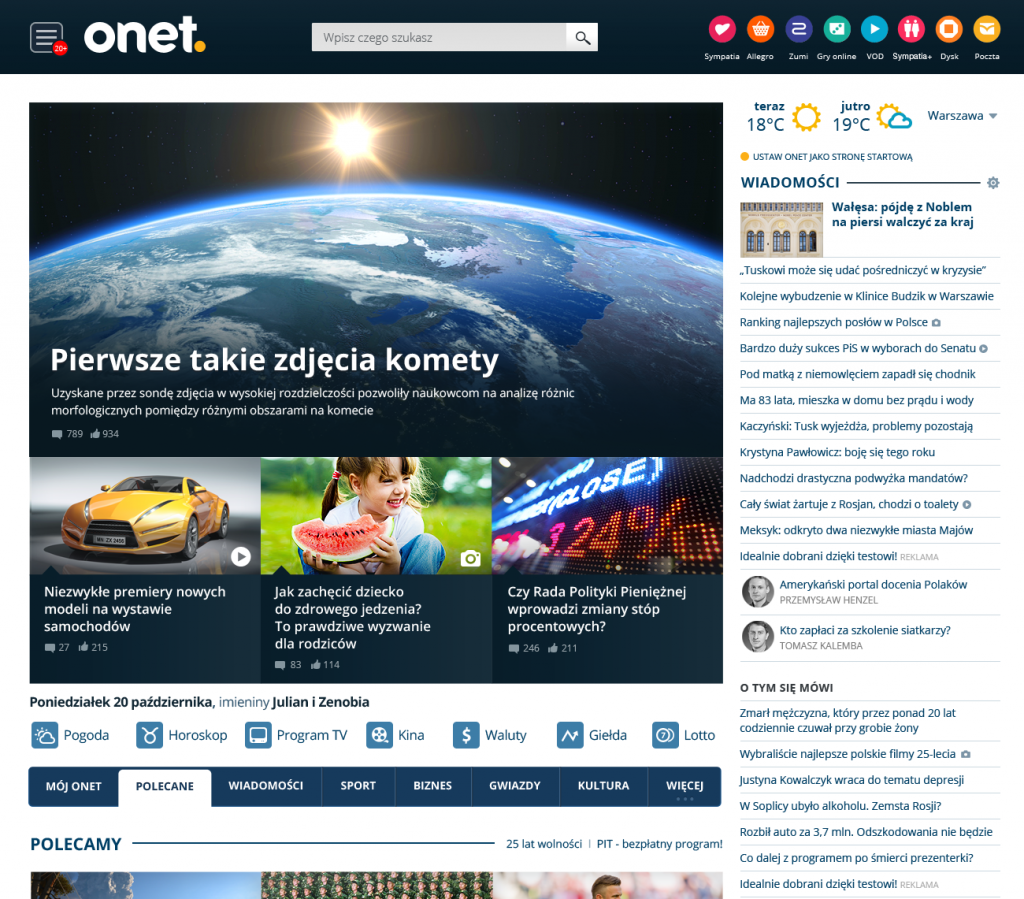 W poniedziałek 20 października br. Onet stanie się medium dostosowanym do indywidualnych preferencji użytkowników. Zachodzące zmiany dotyczą trzech obszarów: treści (otwarcie Onetu na nowych, niezależnych autorów), funkcjonalności (możliwości obserwowania wybranych tematów, twórców czy brandów mediowych) oraz design’u. Nowa strona główna, to nie tylko zmiany w sferze wizualnej, to przede wszystkim wdrożenie innowacyjnych rozwiązań pozwalających użytkownikom na szybki dostęp do preferowanych treści.