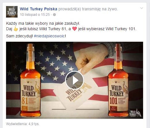 Dzięki relacji live na profilu Wild Turkey Polska w zaledwie 4 godziny udało się dotrzeć organicznie aż do 50% fanów. W tym czasie na post zareagowało 221 osób, a wyświetliło go aż 4,9 tys. użytkowników. To pierwsza taka akcja w Polsce przeprowadzona na profilu alkoholowym.