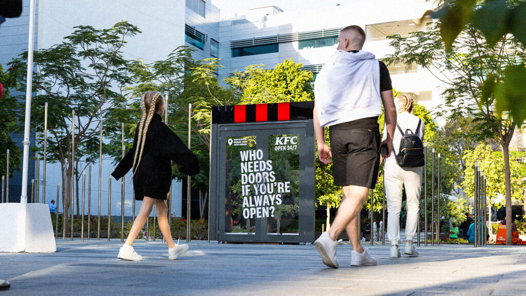 Zamiana tradycyjnych drzwi na takie, które zachęcają do odwiedzenia KFC nawet w środku nocy, to nie wszystko. W ramach kampanii „KFC Out-Doors” na witrynach pojawiły się również kody QR, po zeskanowaniu których można otrzymać darmowy produkt w pobliskich całodobowych lokalach KFC.