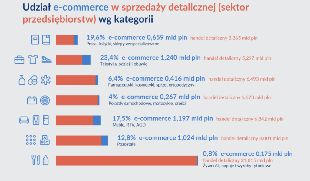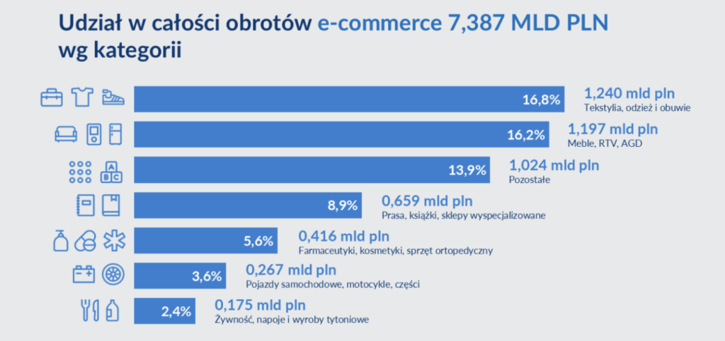 Obroty w e-handlu w lipcu 2025 roku stanowiły 8,6% obrotów handlu detalicznego realizowanych w sektorze przedsiębiorstw (85,898 mld PLN) i osiągnęły wartość 7,387 mld PLN. Były one o 2,9% większe niż w czerwcu. Wzrost miał charakter sezonowy. Wyniki okazały się o 2,5% wyższe niż przed rokiem.