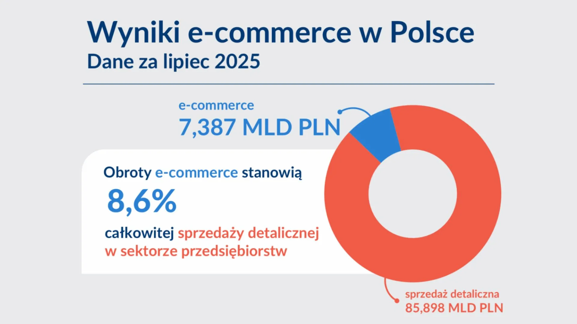 Obroty w e-handlu w lipcu 2025 roku stanowiły 8,6% obrotów handlu detalicznego realizowanych w sektorze przedsiębiorstw (85,898 mld PLN) i osiągnęły wartość 7,387 mld PLN. Były one o 2,9% większe niż w czerwcu. Wzrost miał charakter sezonowy. Wyniki okazały się o 2,5% wyższe niż przed rokiem.