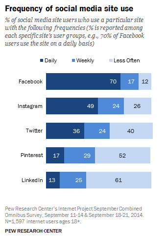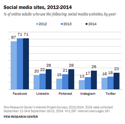 Twittera używa ok. 23% dorosłych użytkowników internetu. Jest szczególnie popularny wśród osób młodych. Co ważne ponad 80% z nich aktywnie twittuje na swoich telefonach komórkowych. Wzrasta liczba użytkowników Instagrama i wynosi już 300 milionów osób. Przeważają tutaj głównie kobiety w wieku od 18-29 lat. Codziennie na Instagramie jest umieszczanych 70 milionów zdjęć i filmików. Podobnie jest z Pintererestem, który jednak słabo przyjął się w Polsce. Używa go ok. 28% dorosłych użytkowników sieci, czyli 70 milionów osób, z czego kobiety to aż około 80%. LinkedIn z kolei ma już około 347 milionów zarejestrowanych członków. Platforma jest bardzo popularna zwłaszcza wśród absolwentów szkół wyższych.