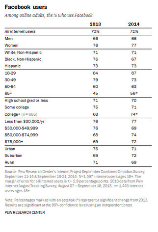 Wzrasta procent osób w wieku 65 i starszych korzystających z Facebooka – zwłaszcza kobiet.