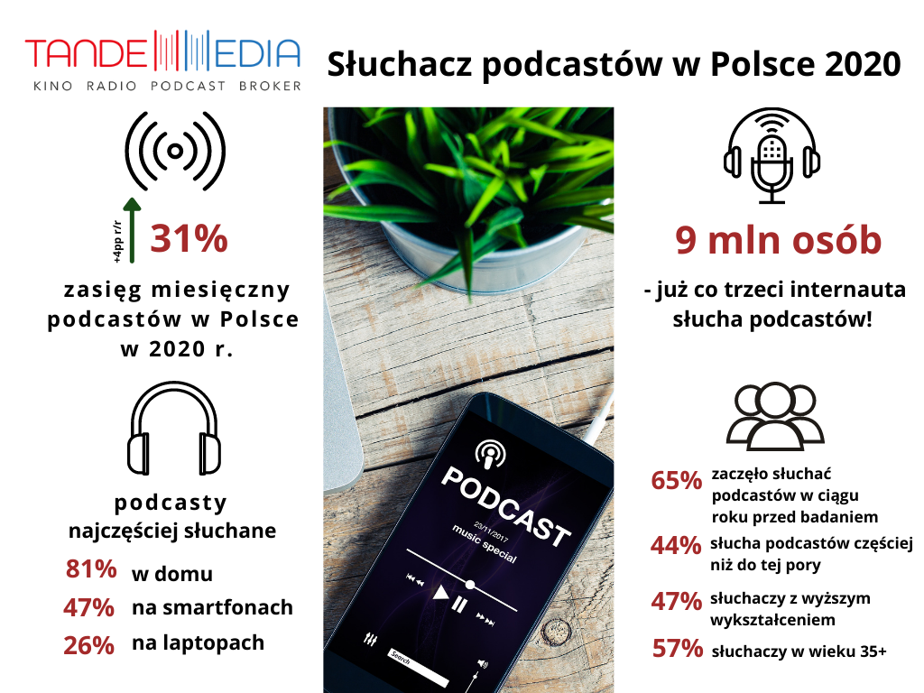 Raport z badania Tandem Media „Słuchacz podcastów w Polsce”, zrealizowanego z Publicis Groupe w listopadzie 2020 r., przyniósł wiele ważnych informacji na temat osób korzystających z oferty podcastowej w Polsce. Przede wszystkim potwierdził, że jej zasięg w naszym kraju rośnie – w 2020 r. wyniósł 31%, co oznacza, że podcastów słucha już niemal co trzeci internauta, czyli prawie 9 milionów osób!