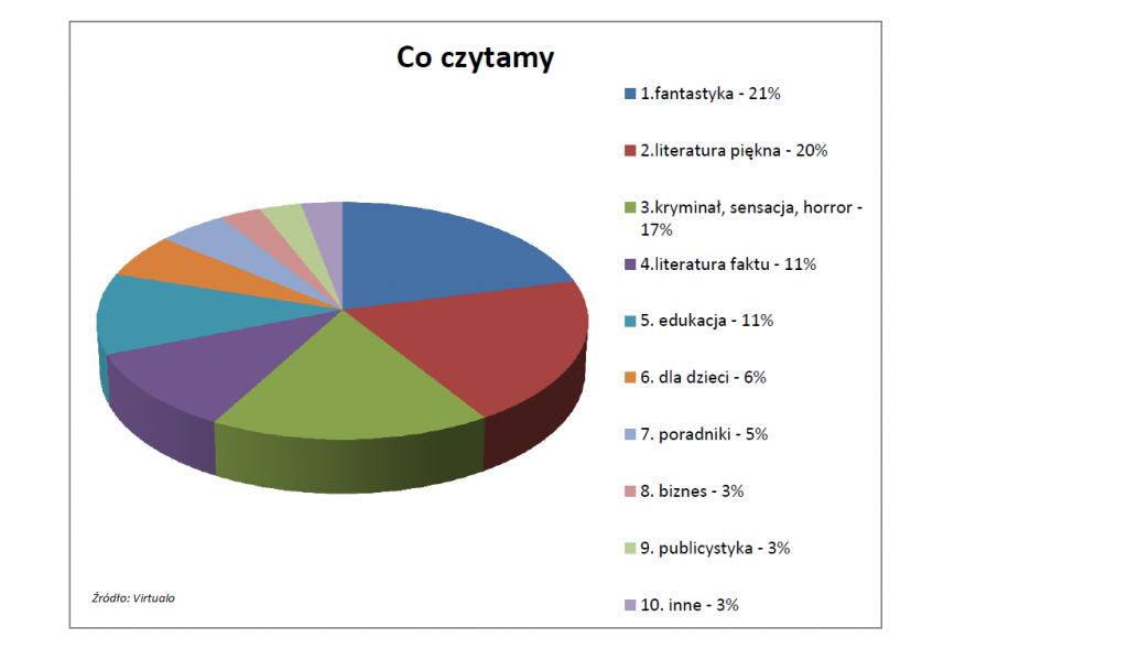 Najczęściej jak wynika z badania czytamy ebooki z kategorii: fantastyka 21% wskazań oraz literaturę piękną – jak deklaruje 20% badanych oraz kryminał, sensacje i horror – łącznie 17% e-czytelników. Chętnie sięgamy również po literaturę faktu i e-książki edukacyjne – obie kategorie wskazuje po 11% badanych. Na kolejnych pozycjach na liście najczęściej czytanych ebooków są tytuły dla dzieci, poradniki oraz książki biznesowe i publicystyka.
