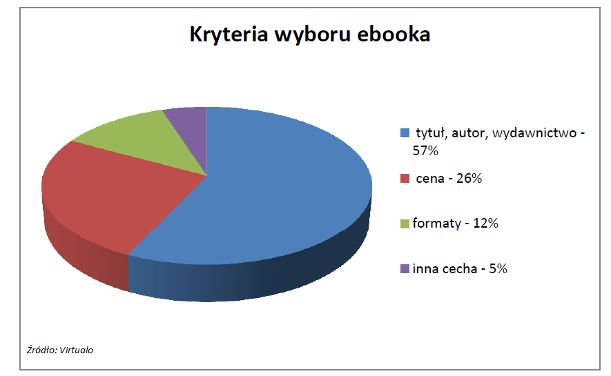 Dla fanów ebooków najważniejszy przy wyborze jest tytuł, autor oraz wydawnictwo – łącznie 57% wskazań. Kolejną kluczową kwestią jest oczywiście cena, którą zaznaczyło w ankiecie ponad 26% uczestników badania. Wybierając ebooka oczywiście kierujemy się również dostępnymi formatami jak wskazuje 12% badanych, pozostałych 5% podaje inne mniej znaczące cechy. W tym miejscu warto wspomnieć o bundlach czyli pakietach składających się z książki drukowanej oraz ebooka o tym samym tytule, które zostały wprowadzone na rynek w czerwcu tego roku przez Virtualo i Empik. Oferta ta wspiera promocje ebooków wśród tradycyjnych czytelników i zachęca ich do skorzystania z nowej formy lektury.