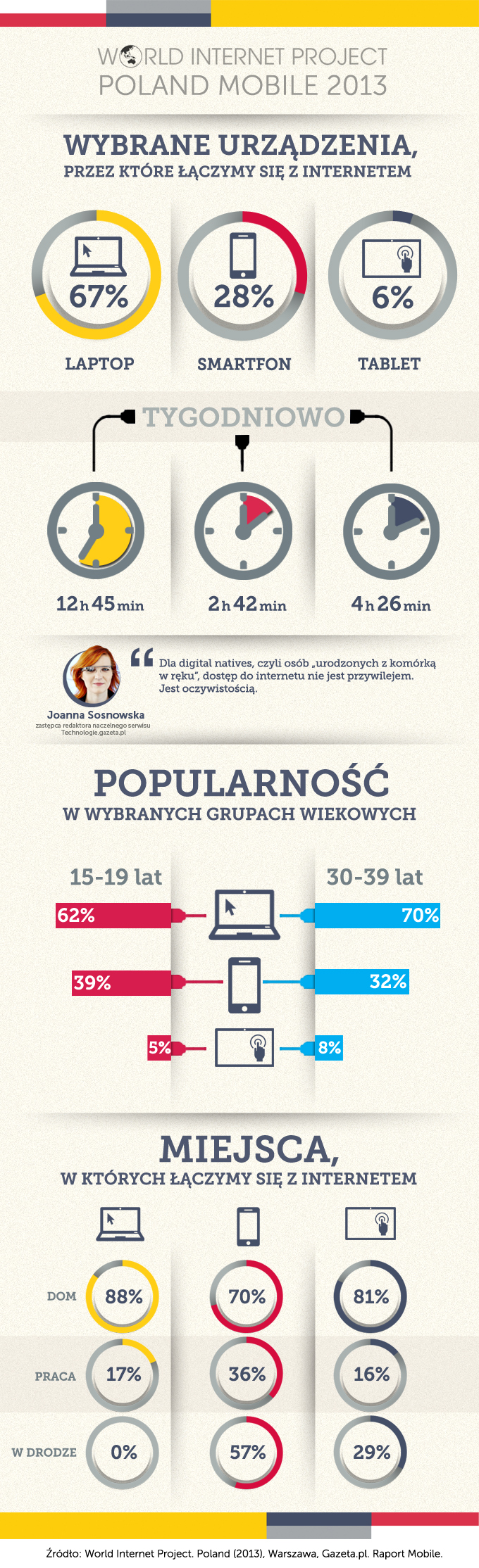 Raport World Internet Project Mobile 2013 wskazuje urządzenia mobilne, dzięki którym Polacy najczęściej podłączają się do sieci. Najbardziej popularnym sprzętem jest laptop, za pomocą którego z internetem łączy się aż 67% jego użytkowników. Na kolejnych miejscach w rankingu popularności znajdują się smartfon (28%) oraz tablet (6%).