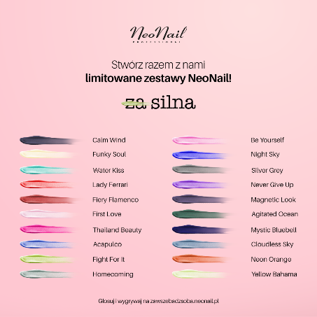 Łącznie we wszystkich głosowaniach na stronie www.zawszebadzsoba.neonail.pl, które odbyły się w dniach 27 marca – 2 kwietnia wzięło udział ponad 10 000 osób. Akcja była promowana w kanałach social media NeoNail. Na Facebooku i Instagramie ukazało się 15 postów informujących o kampanii. Efekty działań w social media to prawie 50 000 reakcji, posty i Stories uzyskały zasięg ponad 1 700 000 i prawie 1 000 000 wyświetleń. NeoNail kolejny raz podkreśla, że to klientki są najważniejsze, mają też realny wpływ na ofertę sprzedażową marki. Zestawy z lakierami hybrydowymi o pojemności 3 ml są odpowiedzią na liczne sugestie dot. wprowadzania kolekcji kolorystycznych lakierów w mniejszych buteleczkach.