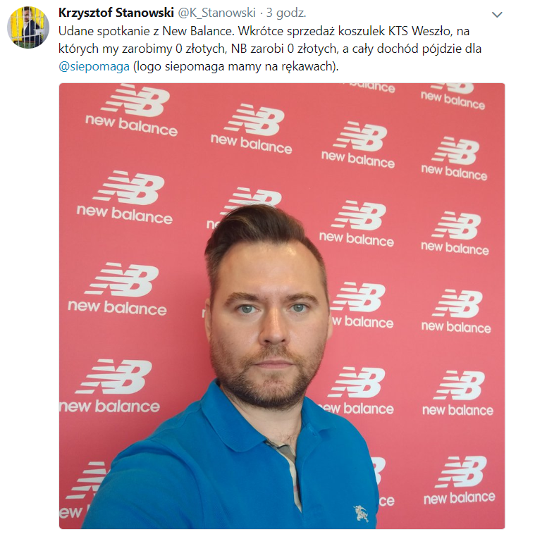 Dziennikarz Krzysztof Stanowski na swoim profilu na Twitterze opublikował zdjęcie wraz z którym ogłosił nową inicjatywę New Balance oraz Klubu Towarszysko-Sportowego Weszło. Fotografia została okraszona opisem: „Udane spotkanie z New Balance. Wkrótce sprzedaż koszulek KTS Weszło, na których my zarobimy 0 złotych, NB zarobi 0 złotych, a cały dochód pójdzie dla @siepomaga (logo siepomaga mamy na rękawach)”.