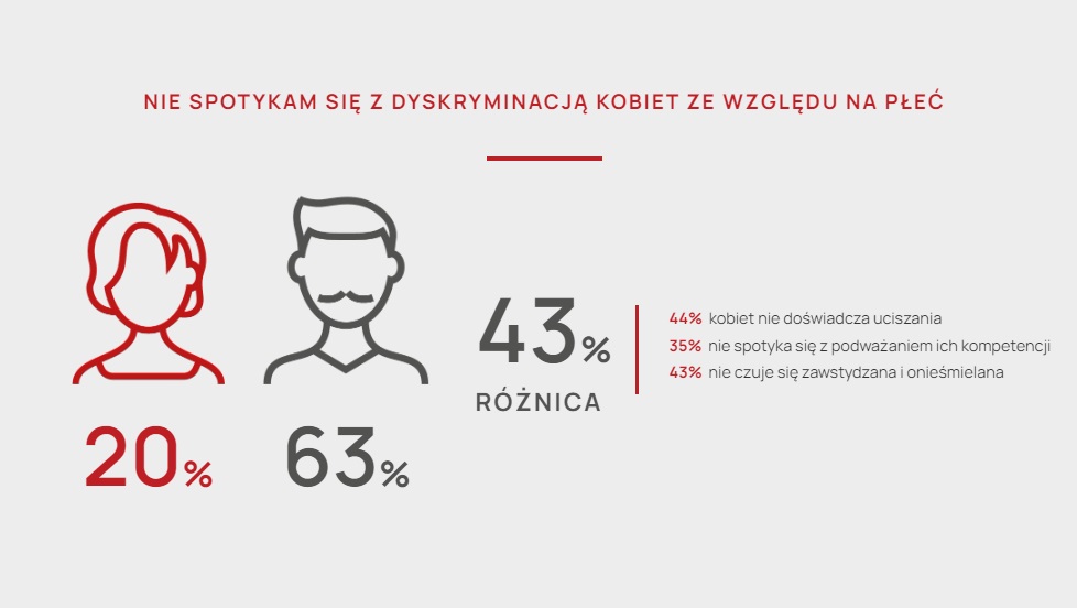 Problem dyskryminacji w pracy również dotyczy przede wszystkim kobiet. Mężczyźni (64 proc.) rzadziej spotykają się z nierównym traktowaniem, co więcej większość z nich – (63 proc.) – problemu dyskryminacji kobiet w pracy nie dostrzega. Co uderzające w tym kontekście – tylko 20 proc. kobiet deklaruje, że w ogóle się z takimi sytuacjami nie spotyka. W rozmowach twierdziły, że doświadczają protekcjonalnego traktowania, a gdy stanowczo wyrażają swoją opinię słyszą nawet, że są zbyt nerwowe lub emocjonalne.