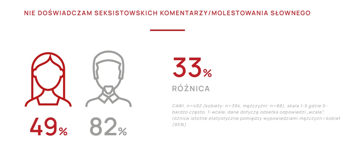 aż 51 proc. kobiet w porównaniu do 18 proc. mężczyzn (różnica 33 proc.) wskazało w badaniu ilościowym, że spotykają się z seksistowskimi komentarzami;