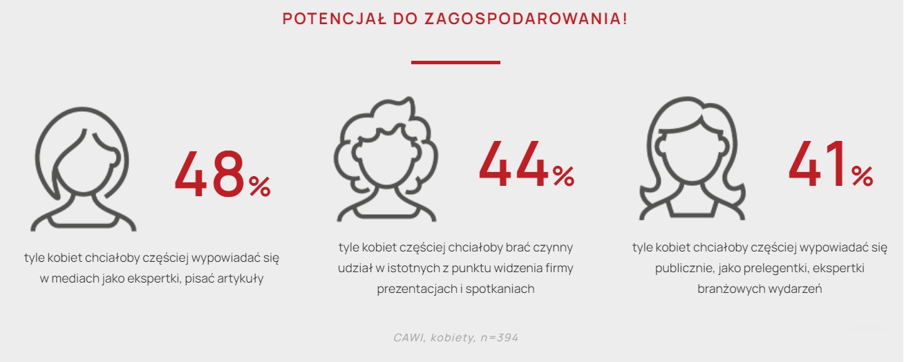 - tylko 9 proc. kobiet wypowiada się jako ekspertki czy pisze artykuły do mediów; 6 proc. wypowiada się publicznie lub występuje jako prelegentki branżowych wydarzeń (w przypadku mężczyzn w branżowych mediach zabiera głos 20 proc., a podczas ważnych wydarzeń – 23 proc.);