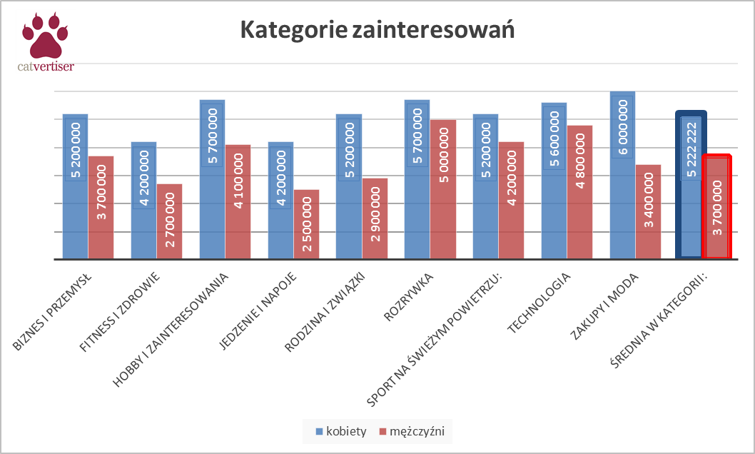 Większa aktywność kobiet na Facebooku znajduje odzwierciedlenie w głównych kategoriach zainteresowań, w których mamy ich średnio 5,2 miliona przy 3,7 milionie mężczyzn. Największą dysproporcję płciową znajdziemy w kategorii zakupy i moda. Widać panie bardzo polubiły kupowanie w sieci, ponieważ do tej grupy zainteresowań Facebook przypisał aż 6 milionów użytkowniczek. Co ciekawe, kobiety przeważają również w wydawać by się mogło zdominowanej przez mężczyzn kategorii technologia. To nic innego, jak potwierdzenie zmieniających się zainteresowań wśród kobiet.