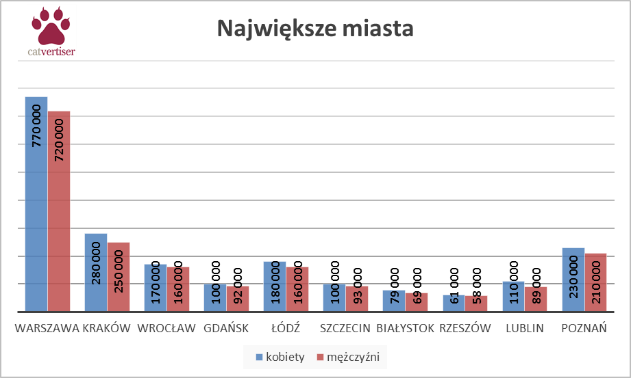 W podziale demograficznym na największe polskie miasta rozkład płciowy jest wyrównany. Wszędzie zauważalna jest niewielka przewaga Pań. Wśród przebadanych miast najwyższa różnica występuje w Lublinie, gdzie około 55% populacji miasta na Facebooku stanowią kobiety.