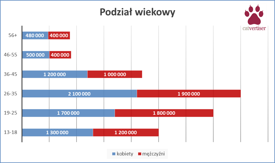 Dzieląc użytkowników Facebooka na kategorie wiekowe możemy zauważyć, że niewielka przewaga mężczyzn występuje jedynie w grupie 19-25 lat, zaś najwięcej kobiet znajduje się w przedziale wiekowym między 26 a 35 lat. Przewaga pań jest także widoczna w Facebookowej strukturze pokoleniowej zarówno w generacji X, jak i pokoleniu Millenium.