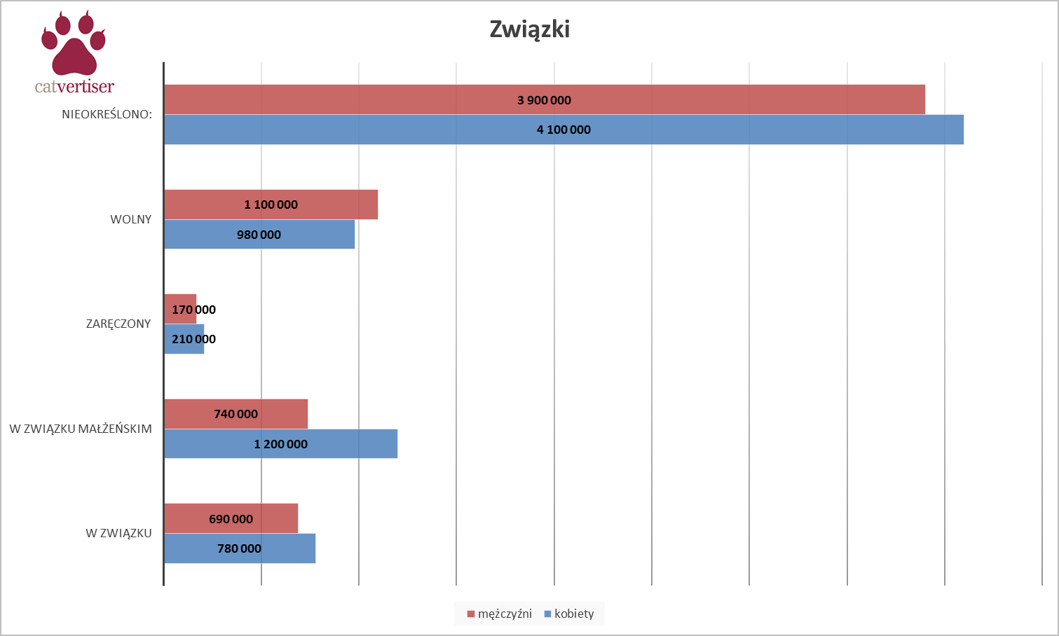Kobiety zdecydowanie chętniej dzielą się informacjami o statusie swojego związku. Ok. 1,2 miliona z nich znajduje się w kategorii „w związku małżeńskim”. Zbliżona liczba występuje w kategorii osób, które oznaczyły swój status, jako „w związku” bądź „zaręczony”. Co ciekawe jedyną kategorią, w której występuje większa liczba mężczyzn to osoby oznaczające swój stan, jako „wolny”. Nadal jednak przeważająca liczba użytkowników postanawia nie dzielić się informacjami o swoim życiu prywatnym i nie deklaruje swojego statusu.