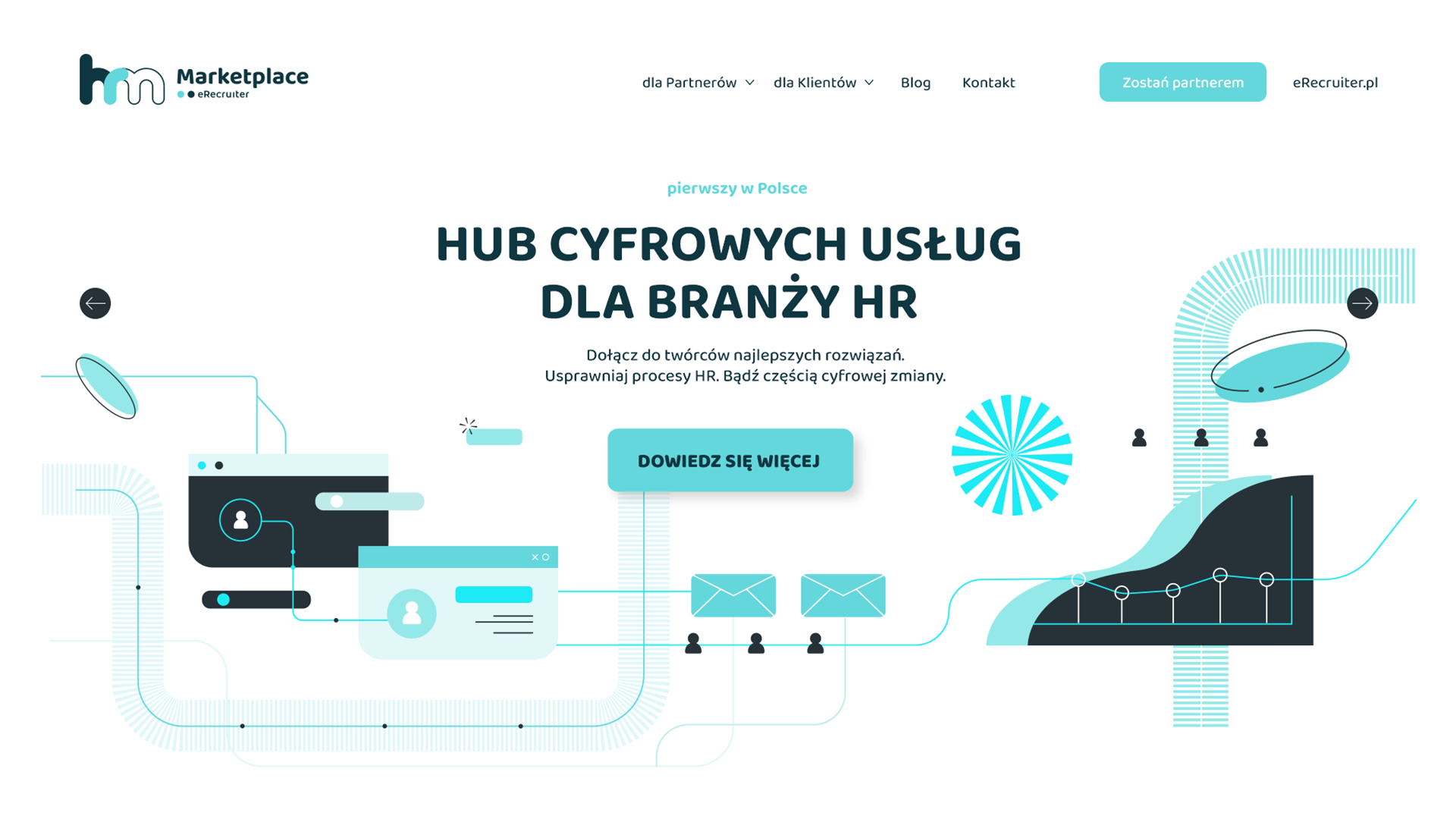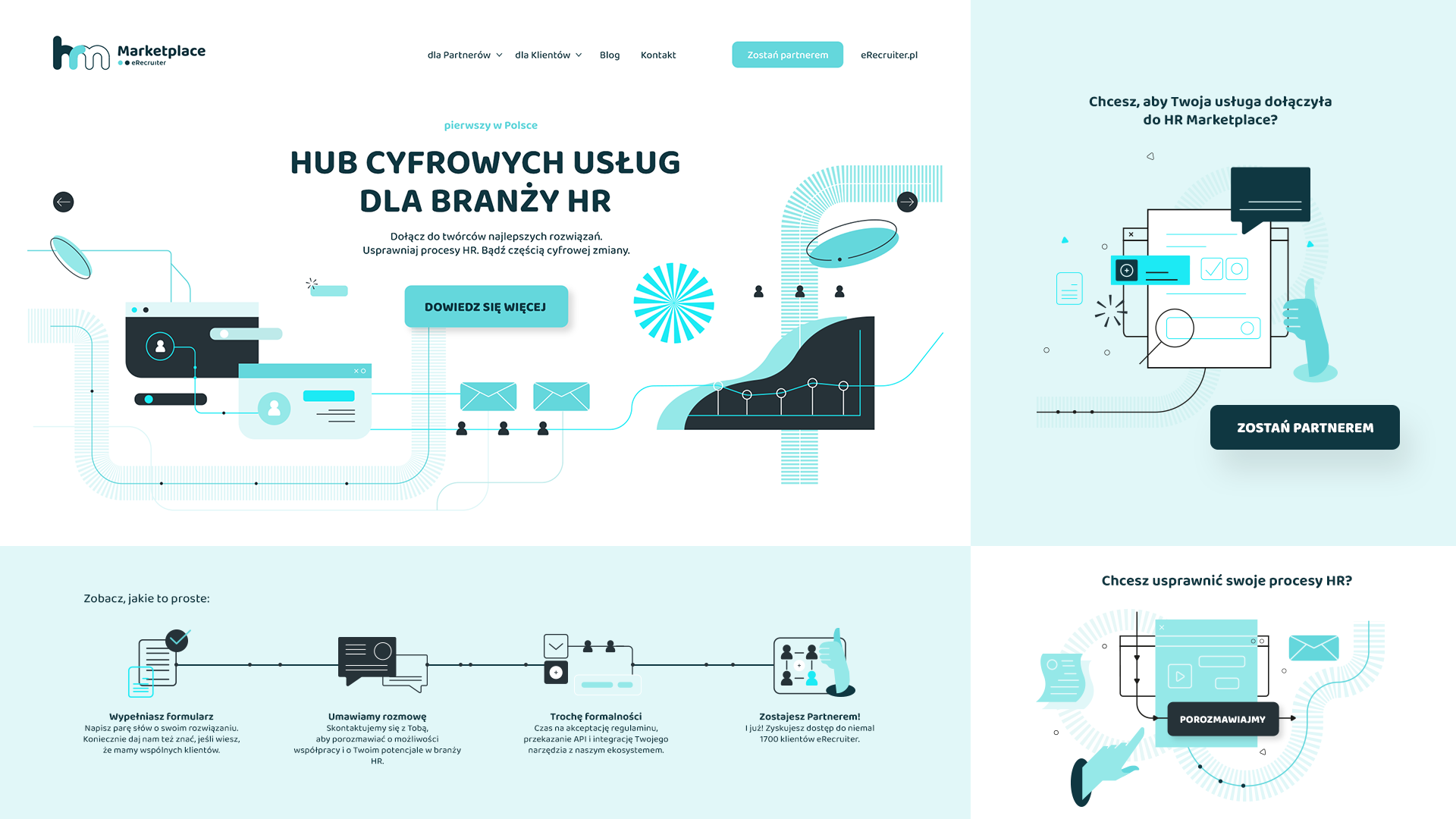 Praca nad HR Marketplace była ciekawym wyzwaniem, ponieważ do opracowania mieliśmy od podstaw zupełnie nową markę, która miała nawiązywać do usługi doskonale wszystkim znanej, czyli platformy do zarządzania rekrutacjami eRecruiter, należącej do Grupy Pracuj. Otwartość i zaufanie jakim obdarzył nas klient sprawiło, że mieliśmy sporo przestrzeni na projekty kreatywne zarówno pracując nad identyfikacją wizualną, jak również nad stroną internetową. Takie podejście zaprocentowało i w efekcie powstał ilustracyjny ton komunikacyjny, który można w formie interaktywnej zobaczyć na stronie – mówi Marcin Piwnicki, CEO i dyrektor kreatywny Kohe.