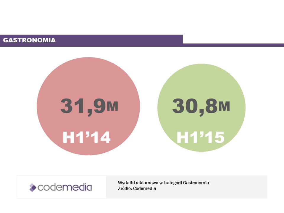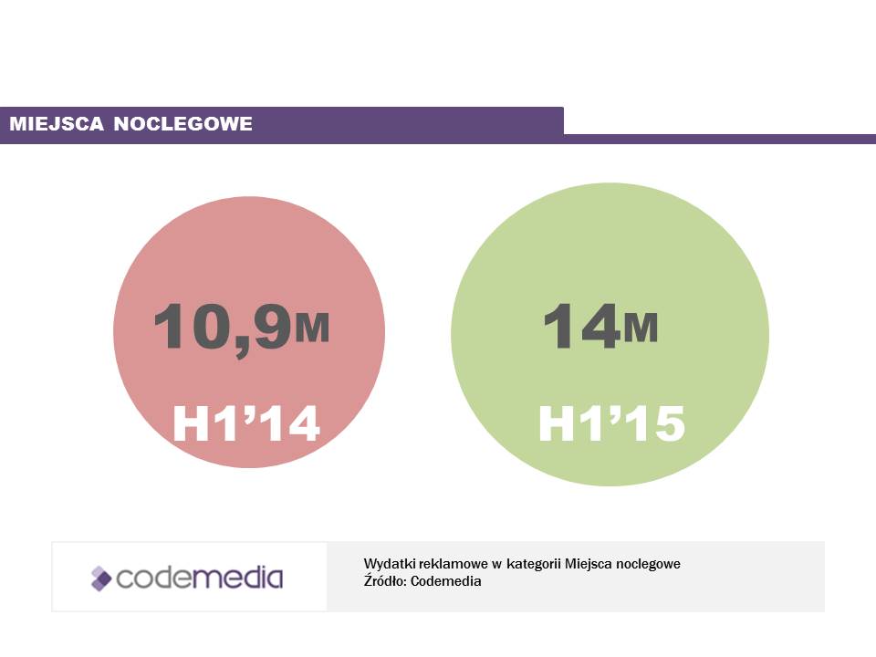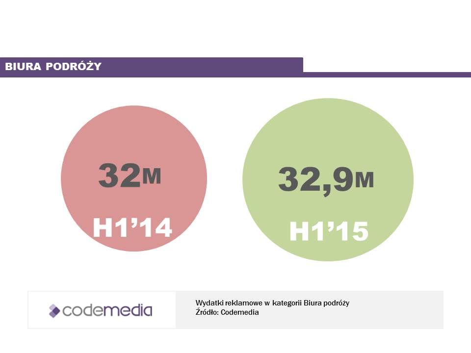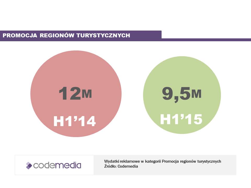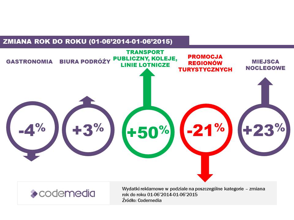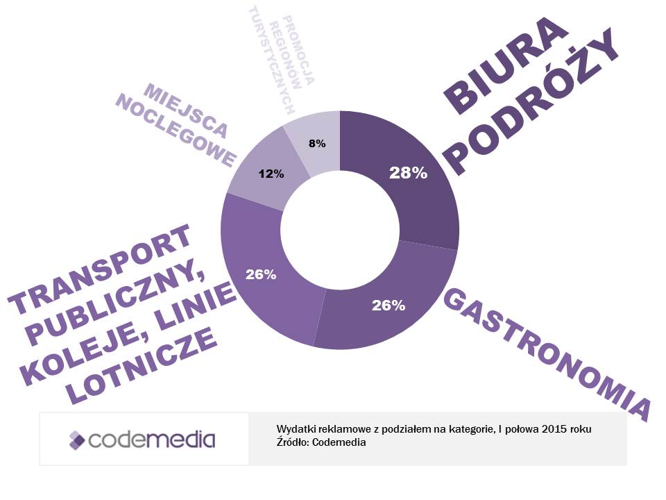 W analizowanym okresie najwięcej w promocję zainwestowały biura podróży przeznaczając na ten cel ponad 32 miliony złotych (28% wszystkich wydatków) – o 3% więcej niż w okresie od stycznia do czerwca 2014 roku. Drugie miejsce z udziałem na poziomie 26% i kwotą ponad 31 milionów zajęły firmy z kategorii transport publiczny, koleje i linie lotnicze. Ten sektor zanotował najbardziej dynamiczny wzrost wydatków w stosunku do pierwszej połowy 2014 roku – zwiększając je dwukrotnie. Prawie 31 milionów wynosiły budżety, jakie na reklamę przeznaczyła gastronomia, która zanotowała z kolei nieznaczny spadek o 4% w porówaniu z analogicznym okresem 2014 roku. Zestawienie zamyka promocja miejsc noclegowych (12%, 14 milionów) i regionów turystycznych (8% i 9,5 miliona), która to kategoria zanotowała z kolei najwiekszy spadek nakladów o 21%.