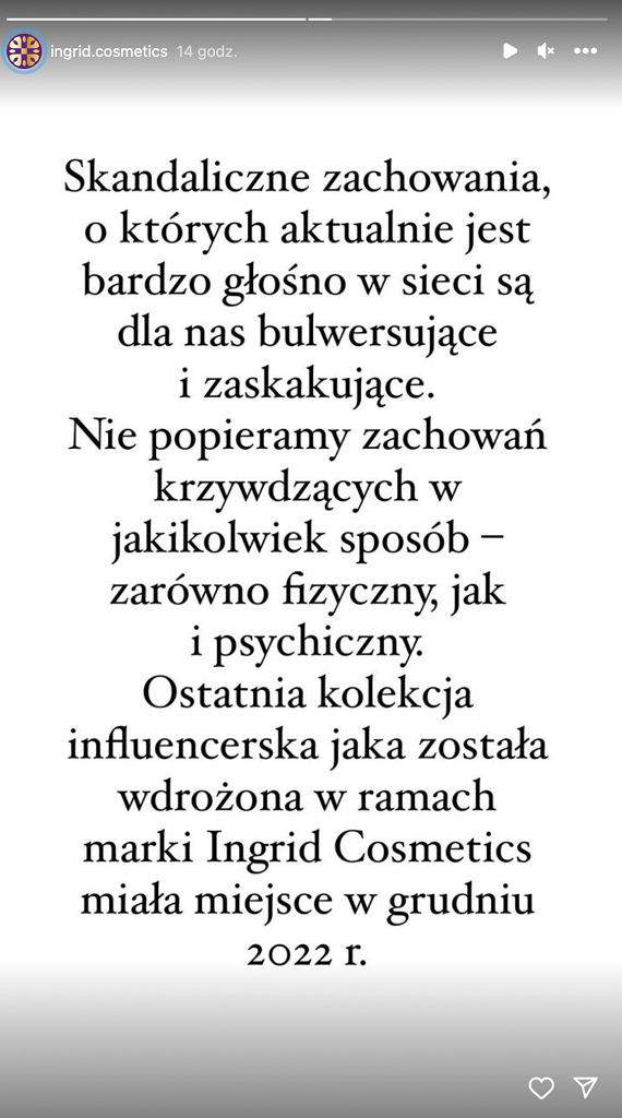 – Skandaliczne zachowania, o których aktualnie jest bardzo głośno w sieci są dla nas bulwersujące i zaskakujące. Nie popieramy zachowań krzywdzących w jakikolwiek sposób – zarówno fizyczny, jak i psychiczny – napisano na profilu marki Ingrid Cosmetics w serwisie Instagram.