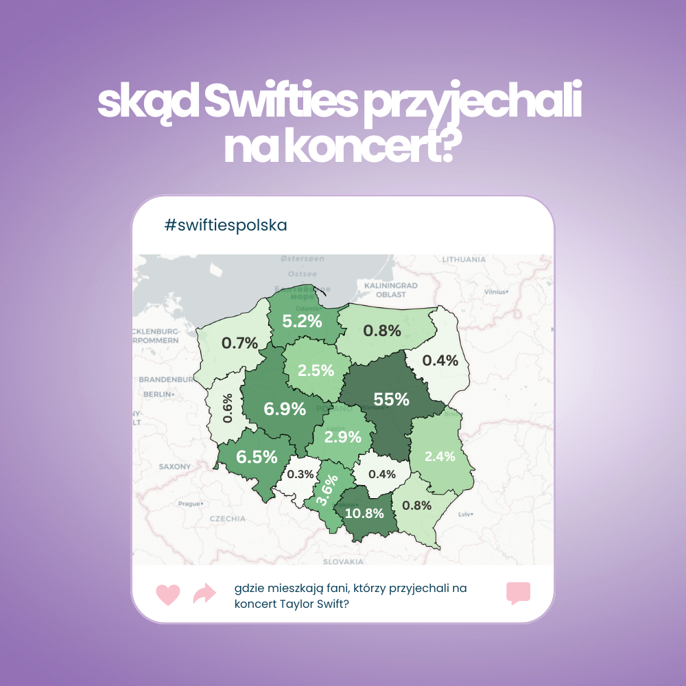 Taylor Swift to prawdziwy magnes – choć jej fani zjechali się z całej Polski, to według analizy dataplace.ai najwięcej z nich przybyło z województw: mazowieckiego (55%), małopolskiego (10,8%) oraz wielkopolskiego (6,9%).