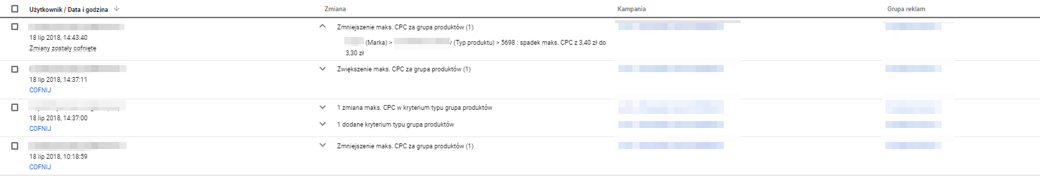 Czy zdarzyło Wam się podczas optymalizacji zmienić stawki CPC złym produktom, lub po prostu zapędziliście się podczas cięcia kosztów? Powrót do poprzednich ustawień jest w takim przypadku bardzo utrudniony lub wręcz niemożliwy, jeśli nie zorientujemy się w sytuacji zaraz po dokonaniu przez nas zmian. W Google Ads w końcu pojawiła się w Historii zmian opcja, która pozwala cofnąć zmiany stawek CPC w kampaniach PLA! Według nas jest to ogromne udogodnienie – szkoda, że wprowadzono je tak późno.