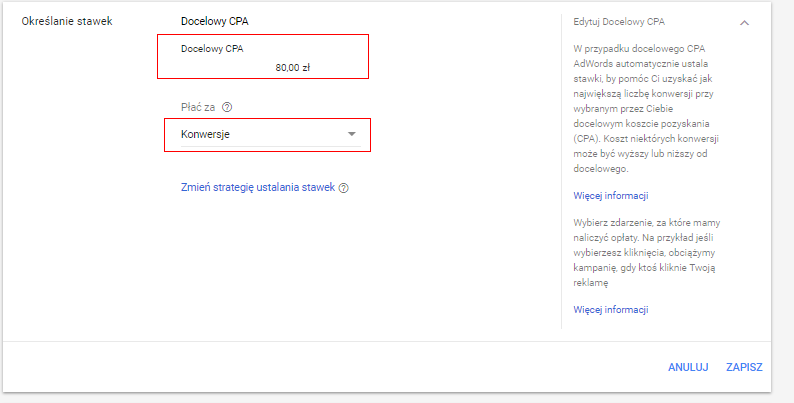 W kampaniach sieci GDN pojawiła się możliwość utworzenia nowej strategii ustalania stawek – Płatność za konwersje. Nowa strategia pozwala prowadzić kampanie reklamowe za darmo, aż do momentu osiągnięcia konwersji. Nie płacimy już za każde kliknięcie, tylko dopiero za osiągnięcie ustalonego celu. Aby skorzystać z Pay Per Conversion, należy wygenerować ponad 100 konwersji w ciągu ostatnich 30 dni. Czas potrzebny na zrealizowanie konwersji musi być krótszy niż 7 dni od momentu kliknięcia reklamy.