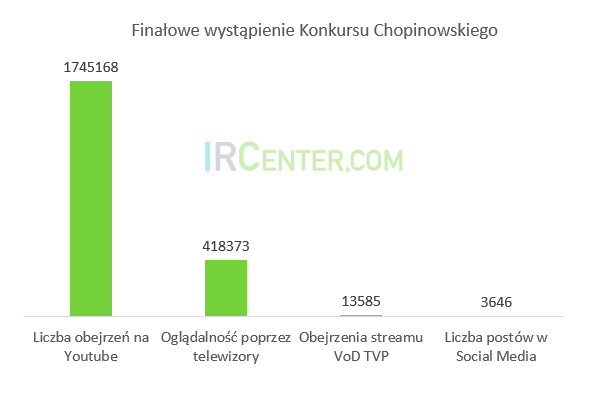 Konkurs Chopinowski na co dzień był najczęściej oglądany na tradycyjnych telewizorach (średnio 65 tyś. obejrzeń dziennie). Na VoD oglądało go kilkanaście tysięcy ludzi. W mediach społecznościowych codziennie pojawiało się na ten temat 1000 postów i komentarzy.