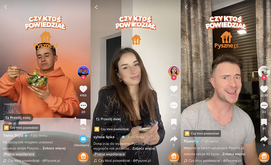 Do zabawy „Czy ktoś powiedział Pyszne.pl” dołączyli znani na TikToku influencerzy. Marka promuje w ten sposób swój konkurs wśród organicznych użytkowników platformy.