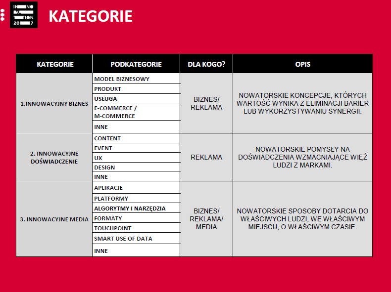 - Innowacyjne media – gdzie można zgłaszać sposoby dotarcia do właściwych ludzi, we właściwym miejscu, i o właściwym czasie.