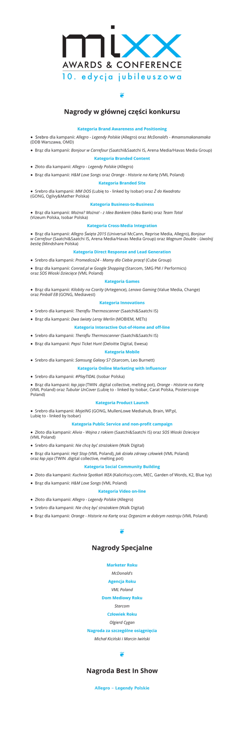 Wieloetapowe, intensywne i wypełnione merytorycznymi dyskusjami obrady Jury przyniosły rezultat w postaci nominacji aż 65 kampanii do brązowych, srebrnych i złotych statuetek MIXX 2016. 1 grudnia, podczas finałowej, wieczornej gali poznaliśmy wybieranych przez Jury zwycięzców w 15 konkursowych kategoriach oraz zdobywców 5 nagród za dokonania, wybieranych przez Kapitułę konkursu.