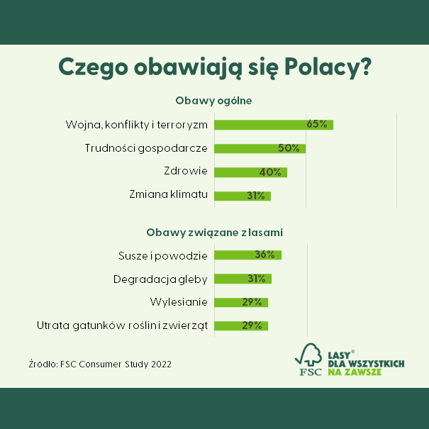 Zarówno w Polsce, jak i na świecie, największe obawy ankietowanych budzą obecnie wojny, konflikty i terroryzm (65% wskazań w polskim badaniu), trudna sytuacja gospodarcza (50%) i kwestie związane ze zdrowiem (40%). Zmiana klimatu zajęła czwarte miejsce na liście, z niemal jedną trzecią wskazań (31%). Zapytani bardziej szczegółowo o zagrożenia związane z lasami, polscy respondenci wskazywali przede wszystkim utratę gatunków zwierząt i roślin, wylesianie, a także spowodowane nim susze i powodzie . W odpowiedziach badanych z innych krajów dobrze widać lokalne uwarunkowania: Hiszpanie i Amerykanie martwią się pożarami lasów, Brazylijczycy – wylesianiem.