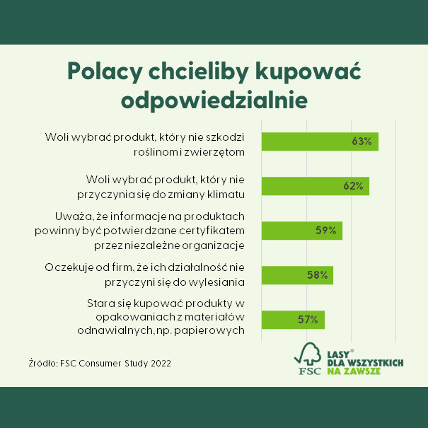 Konsumenci starają się przeciwdziałać degradacji środowiska naturalnego, podejmując odpowiedzialne decyzje zakupowe. Niemal dwie trzecie polskich respondentów deklaruje, że wolałoby wybierać produkty, które nie szkodzą roślinom i zwierzętom, ani nie przyczyniają się do zmiany klimatu (odpowiednio 63% i 62%). Ponad połowa (58%) oczekuje, że firmy nie będą przyczyniać się do wylesiania, 57% chętniej sięga po artykuły w opakowaniach podlegających recyklingowi, np. papierowych, a 56% uważa, że może pomagać chronić lasy, kupując produkty certyfikowane przez niezależne organizacje.