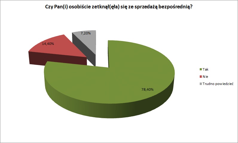 Niemal ośmiu na dziesięciu ankietowanych miało kontakt ze sprzedażą bezpośrednią. Na pytanie Czy Pan(i) osobiście zetknął(ęła) się ze sprzedażą bezpośrednią 74,8% respondentów odpowiedziała twierdząco. Statystyczny klient, dokonujący zakupu w systemie sprzedaży bezpośredniej, to kobieta (59,6%), między 25 a 44 rokiem życia (54,8%), aktywna zawodowo (54,3%) z wykształceniem wyższym (43%) lub średnim (38%), mieszkająca w gminie wiejskiej (40,9%). Co dziesiąta osoba, która miała kontakt ze sprzedażą bezpośrednią jest obecnie stałym klientem tego systemu dystrybucji.