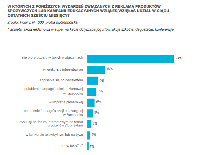 Respondenci dużo lepiej oceniają kampanie edukacyjne niż reklamowe – uważają je za znacznie ciekawsze niż reklamę (75% w stosunku do 45%) i bardziej wiarygodne (69% w odniesieniu do 34%). Angażując się w akcje producentów lub organizacji spożywczych, ankietowani najczęściej wybierają udział w konkursach internetowych. Na taką formę aktywności decydują się głównie osoby do 39. roku życia.