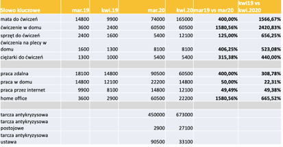 Równolegle, COVID-19 w istotny sposób wpłynął na ruch organiczny w wielu branżach. Widać to w tabeli przygotowanej na podstawie danych z Google Keyword Planner, zawierającej frazy związane z potrzebami konsumentów wywołanymi przez koronawirusa.