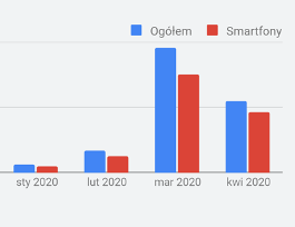 Widzimy zatem wyraźny peak w marcu i zdecydowany spadek w kwietniu. Dotyczy to nie tylko najpopularniejszych fraz. Dla puli prawie 500 fraz kluczowych związanych z koronawirusem (w tym maseczki antywirusowe) łączny potencjał wyszukiwań w kolejnych miesiącach zmieniał się w podobny sposób: