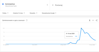 Największe natężenie zapytań związanych z koronawirusem miało oczywiście miejsce w marcu. Wydarzenia takie jak wykrycie pierwszego przypadku w Polsce, czy wprowadzanie kolejnych obostrzeń sprawiło, że wielu użytkowników szukało informacji o COVID-19.