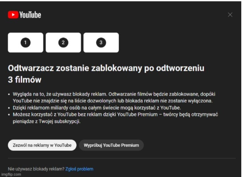 „Odtwarzacz zostanie zablokowany po odtworzeniu trzech filmów” – oto informacja, jaką dostają ostatnio polscy internauci na co dzień mający w przeglądarkach zainstalowane wtyczki blokujące reklamy. Przypomnijmy, że przez wiele lat YouTube był ogólnodostępnym źródłem treści video, cieszącym się popularnością na całym świecie. I to wszystko bez reklam.
