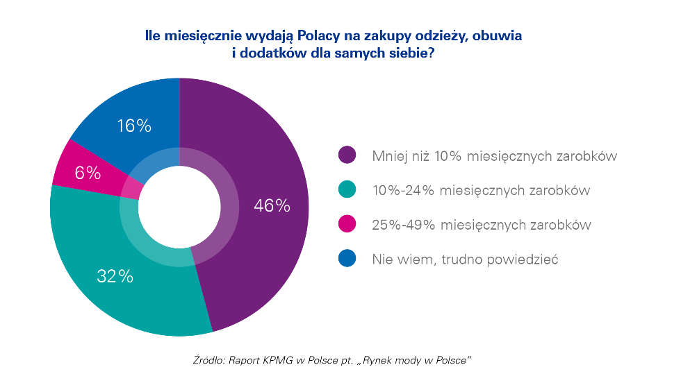 Chęć podążania za trendami przejawia się również w deklarowanych miesięcznych wydatkach na zakup odzieży – osoby, które chętnie łączą style zdecydowanie częściej od pozostałych są skłonne wydać na ubrania nawet połowę swoich miesięcznych dochodów netto. Jednak większość ankietowanych (46% wskazań) przeznacza na zakupy odzieży nie więcej niż 10% swojego miesięcznego wynagrodzenia. Biorąc pod uwagę wysokość średniej krajowej w Polsce oznacza to, że blisko połowa Polaków nie wydaje więcej niż 300 złotych miesięcznie na zakup odzieży, obuwia lub dodatków.