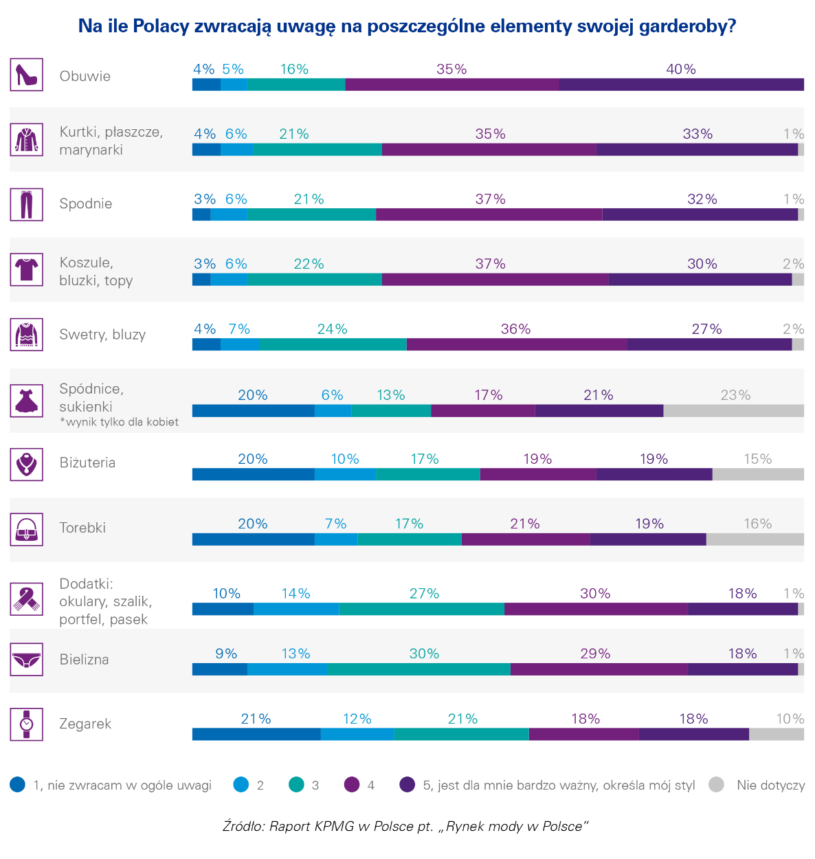 Z badania przeprowadzonego przez KPMG wynika, że najważniejszym elementem ubioru dla Polaków jest obuwie. Co czwarty respondent przyznał, że jest ono bardzo ważnym elementem ubioru, który definiuje jego styl ubierania. Duża uwaga przykładana jest również do okryć wierzchnich oraz części codziennego ubioru – spodni lub spódnic, koszul, bluzek i swetrów. Warto zauważyć, że osoby preferujące biznesowy styl ubierania się dużą uwagę przykładają do zegarków, natomiast modne torebki częściej definiują kobiecy ponadczasowy styl ubierania się.