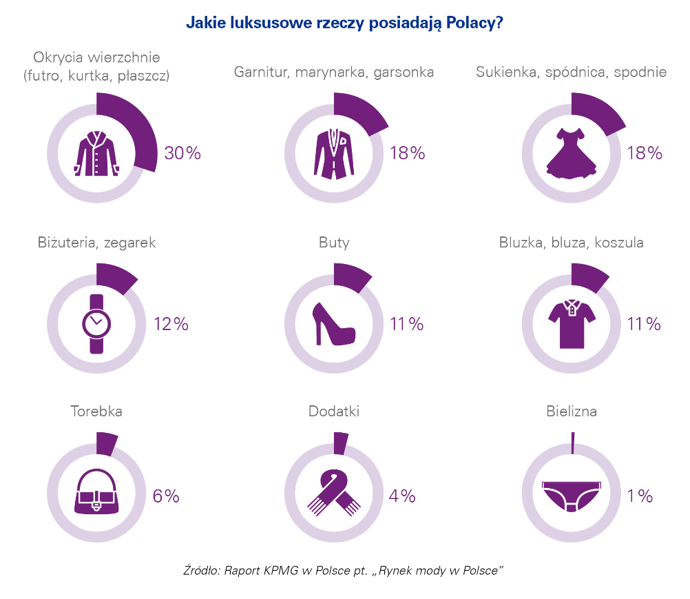 Z badania przeprowadzonego przez KPMG wynika, że zaledwie 3 na 10 dorosłych Polaków posiada w swojej szafie rzeczy, które ich zdaniem są luksusowe. Najczęściej (30% wskazań) są to okrycia wierzchnie, przede wszystkim futra. Blisko co piąta osoba zadeklarowała posiadanie luksusowego garnituru lub luksusowej sukienki, które są przeznaczone na specjalne okazje. Warto jednak podkreślić, że pojęcie luksusu jest względne – choć średnia wartość wymienianych przez respondentów elementów luksusowej garderoby wynosiła 1403 zł, to połowa z nich była warta nie więcej niż 1000 złotych.