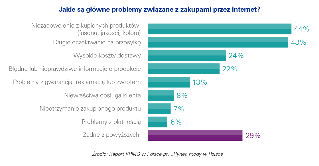 Blisko połowa ankietowanych (48% wskazań) nigdy nie zwróciła produktu kupionego przez internet. Ci, którzy na zwrot się zdecydowali, najczęściej dokonali go zaledwie 2-3 razy, a powodami takiej decyzji było najczęściej niedopasowanie ubrania (69% wskazań) lub zmiana decyzji po zakupie (33% wskazań). Pomimo, że nowoczesne technologie w dynamiczny sposób zmieniają podejście do dokonywania zakupów, to aż 70% Polaków nigdy nie spotkało się z nowymi technologiami podczas przeglądania stron internetowych sklepów odzieżowych lub obuwniczych. Jedyną znaną i używaną funkcjonalnością (27% wskazań) jest możliwość oglądania przedmiotów w widoku 360 stopni poprzez samodzielne sterowanie kątem nachylenia obrazu.