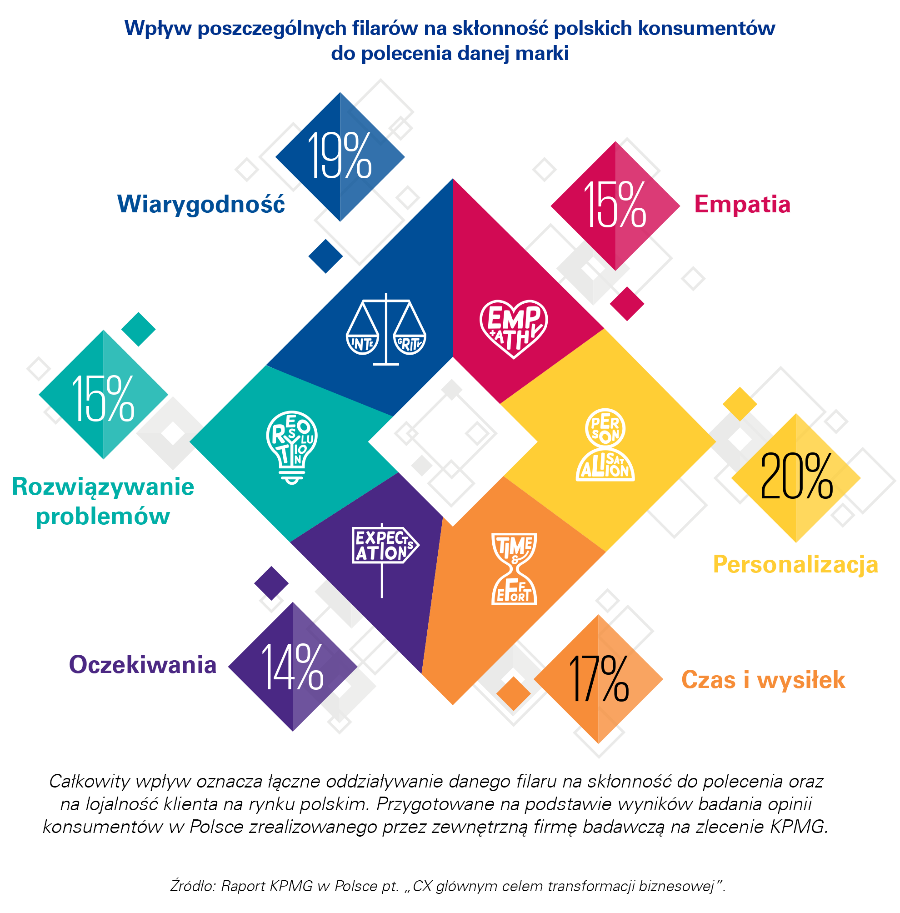 Konsumenci w Polsce już po raz trzeci dokonali oceny swoich doświadczeń w interakcjach z ponad 200 firmami obecnymi na polskim rynku. Analogiczne badania wg tej samej metodologii zostały przeprowadzone przez KPMG w innych krajach na świecie. Analiza doświadczeń konsumentów z różnymi markami została oparta na bazie unikalnej metodologii Sześciu Filarów™ Customer Experience, która pozwala zrozumieć prawdziwe doświadczenia widziane oczami klienta we wszystkich interakcjach z marką. Tymi filarami są: Wiarygodność, Rozwiązywanie problemów, Oczekiwania, Czas i wysiłek, Personalizacja oraz Empatia. Filary pozwalają lepiej zrozumieć, jakie aspekty są szczególnie istotne dla klienta w całym cyklu relacji z marką i jej produktami, co przekłada się na satysfakcję i lojalność klienta oraz skłonność do rekomendacji marki.