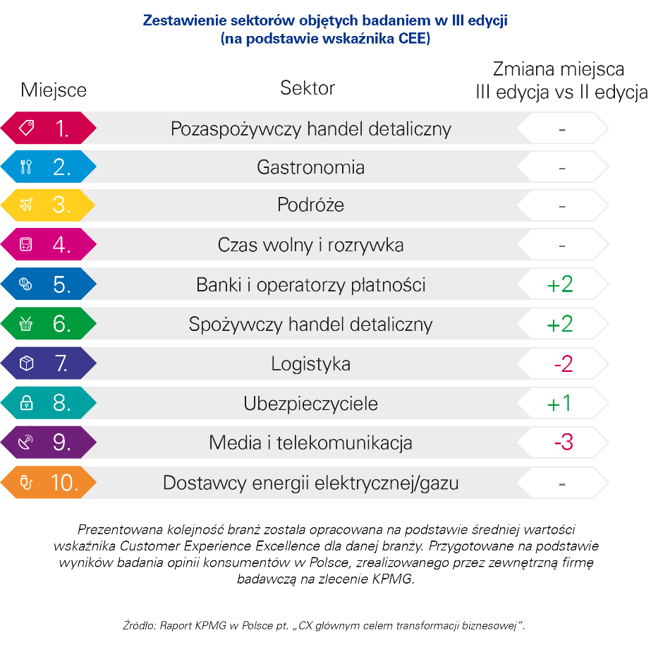 Analizując branże, z których marki zostały ocenione przez konsumentów w badaniu KPMG, największy wzrost odnotował sektor bankowy (plasując się na 5. pozycji, wzrost o dwie pozycje), a największy spadek sektor telekomunikacyjny (spadek na 9. pozycję).