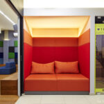 Osobne pokoje „technologiczne” i „projektowe” zapewniają zdecydowanie więcej spokoju niż open space. Ale w razie nagłej potrzeby totalnego wyciszenia się, skupienia w samotności lub po prostu pogadania sobie przez telefon, pracownicy JCommerce mają kilka opcji do wyboru: wyciszone, schowane we wnęce sofy, oldskulową budkę telefoniczną albo tzw. akwarium, w którym każdy może poczuć się jak ryba w wodzie.