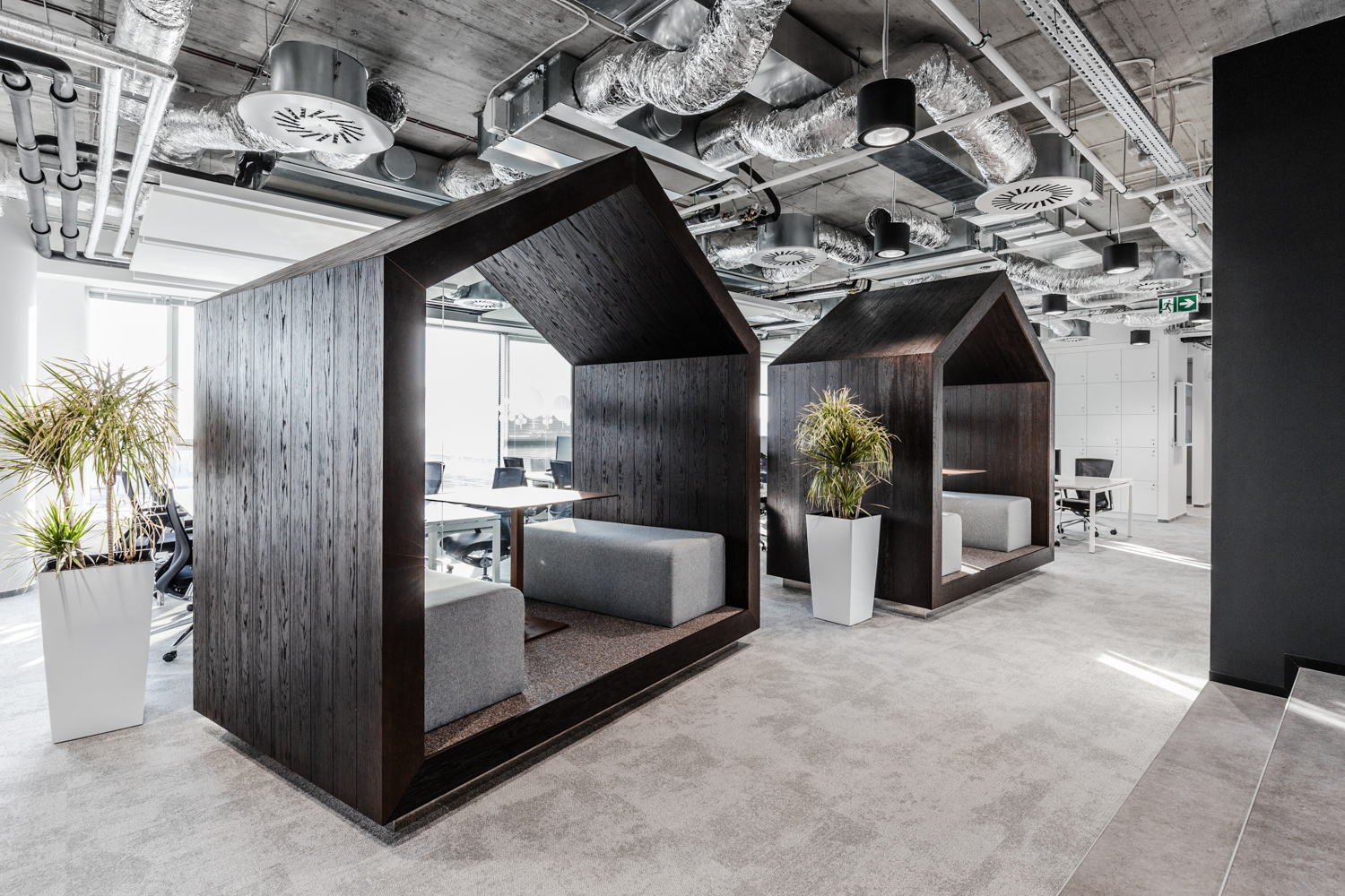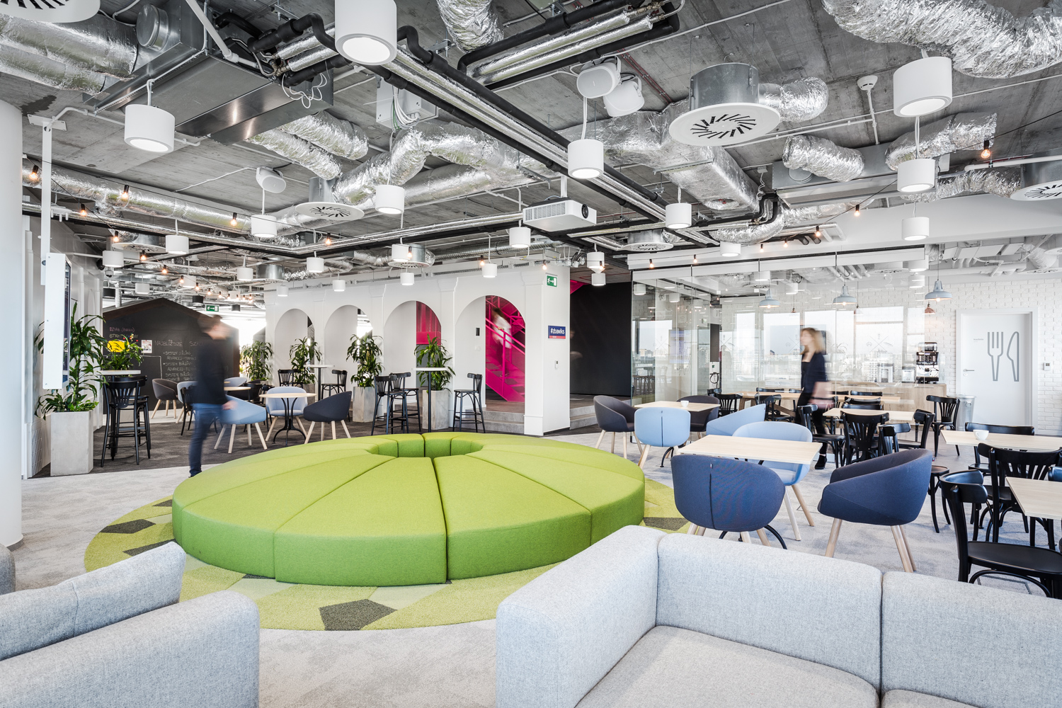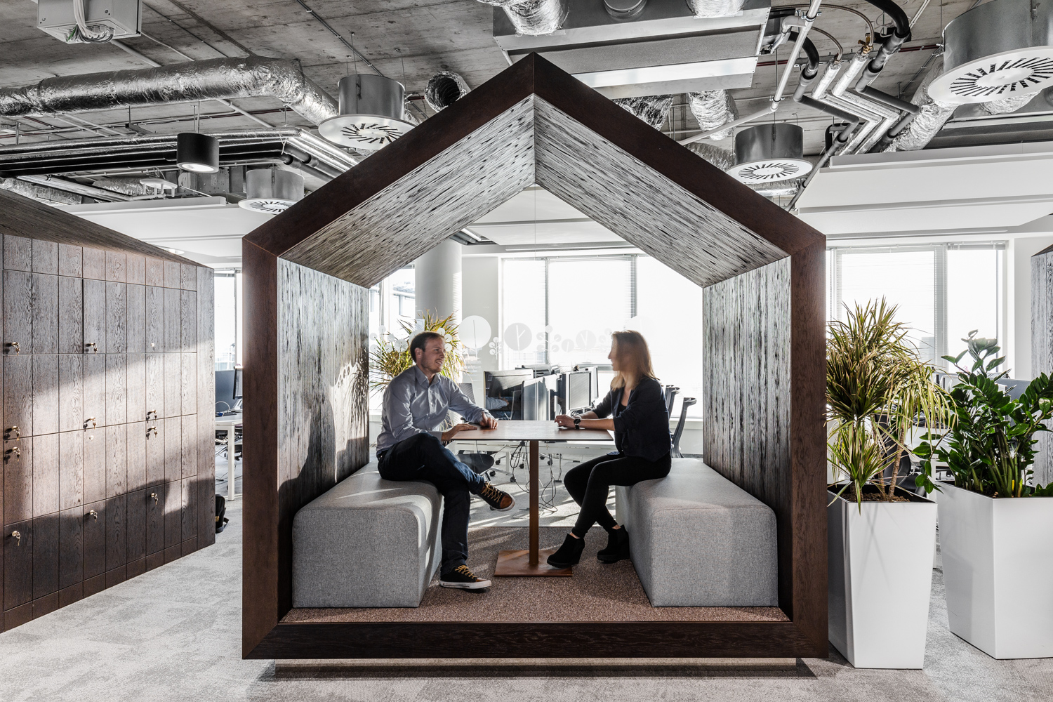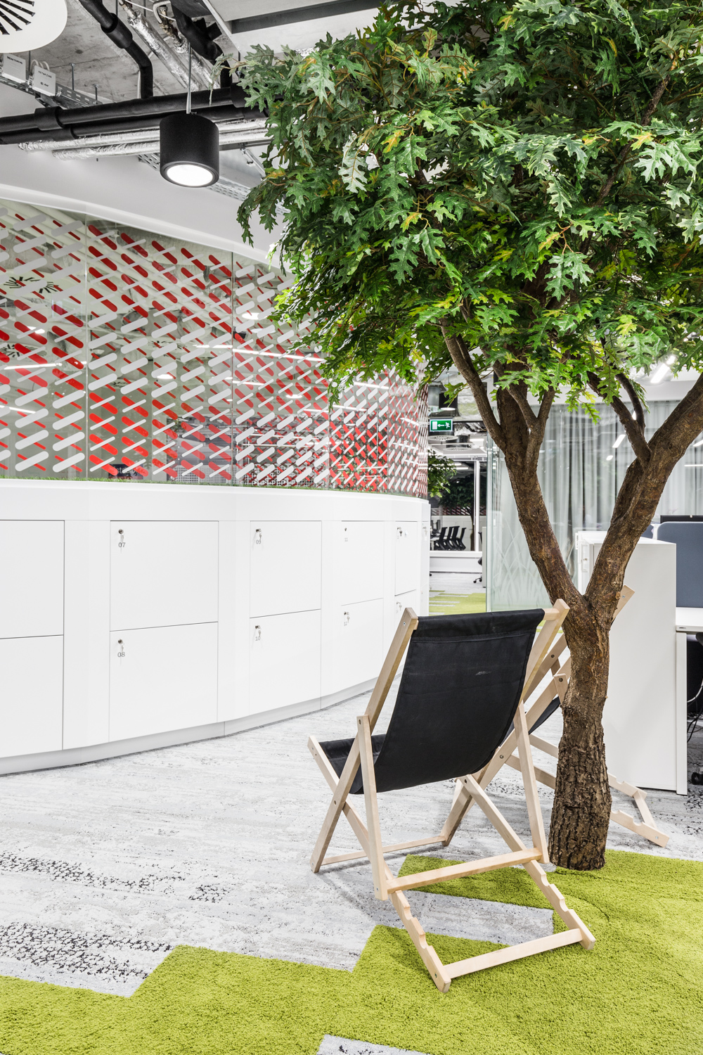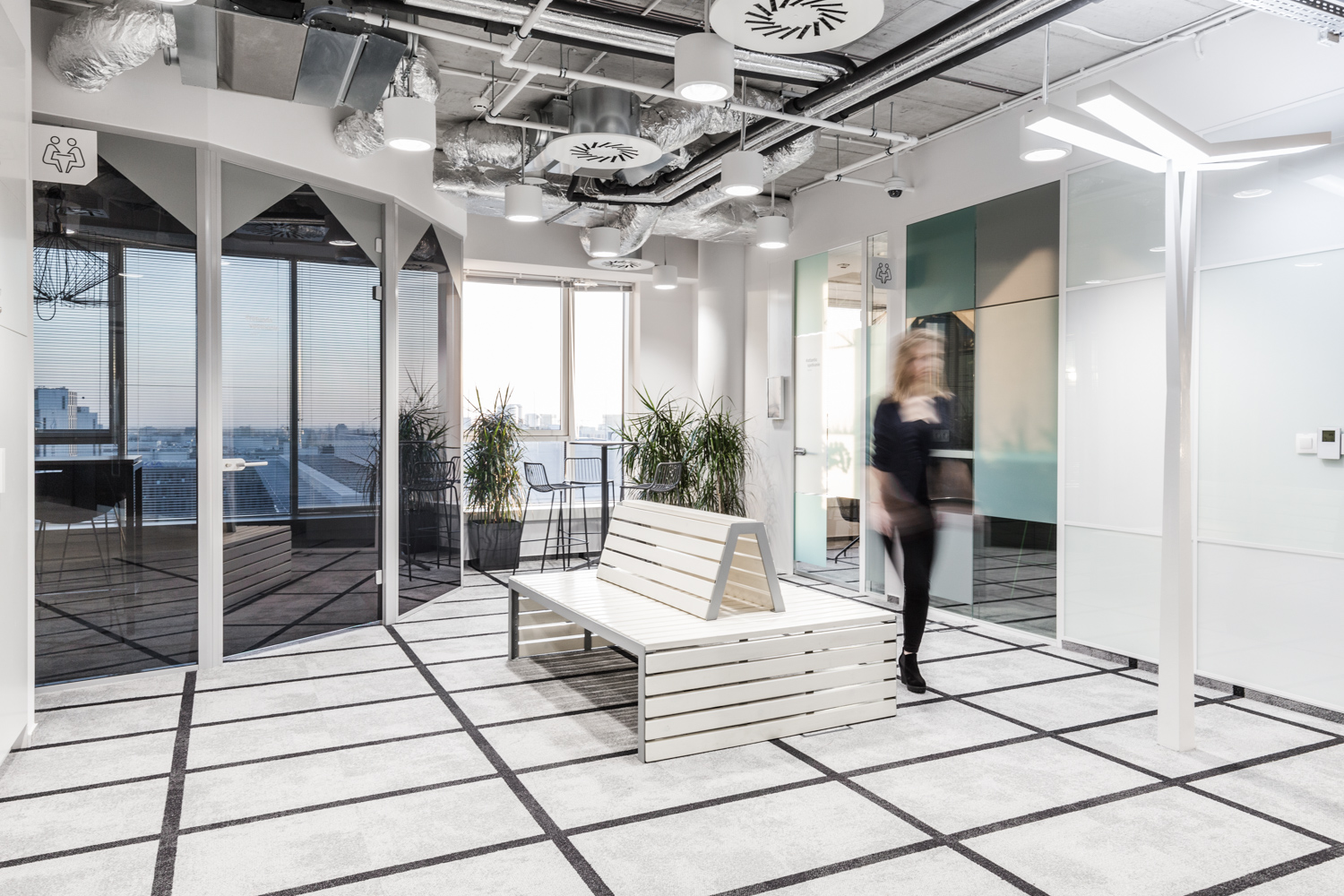 Na szczególną uwagę zasługuje rzadko spotykany w Polsce desk-sharing i space-sharing. W tak zaprojektowanym biurze biurko nie jest przypisane do pracownika, a wszelkie przestrzenie biurowe są współdzielone przez osoby zatrudnione w firmie. Jak obliczyli projektanci Workplace w większości firm w Polsce ze względu na to, że nieustannie prowadzone są spotkania z klientami, część osób pracuje zdalnie, część pozostaje na zwolnieniach lekarskich czy urlopach, efektywnie używanych jest zaledwie około 40% biurek. To średnia. W najlepszym przypadku 10% załogi jest poza biurem. Praktycznie nie zdarza się, aby wszyscy byli na stanowiskach.