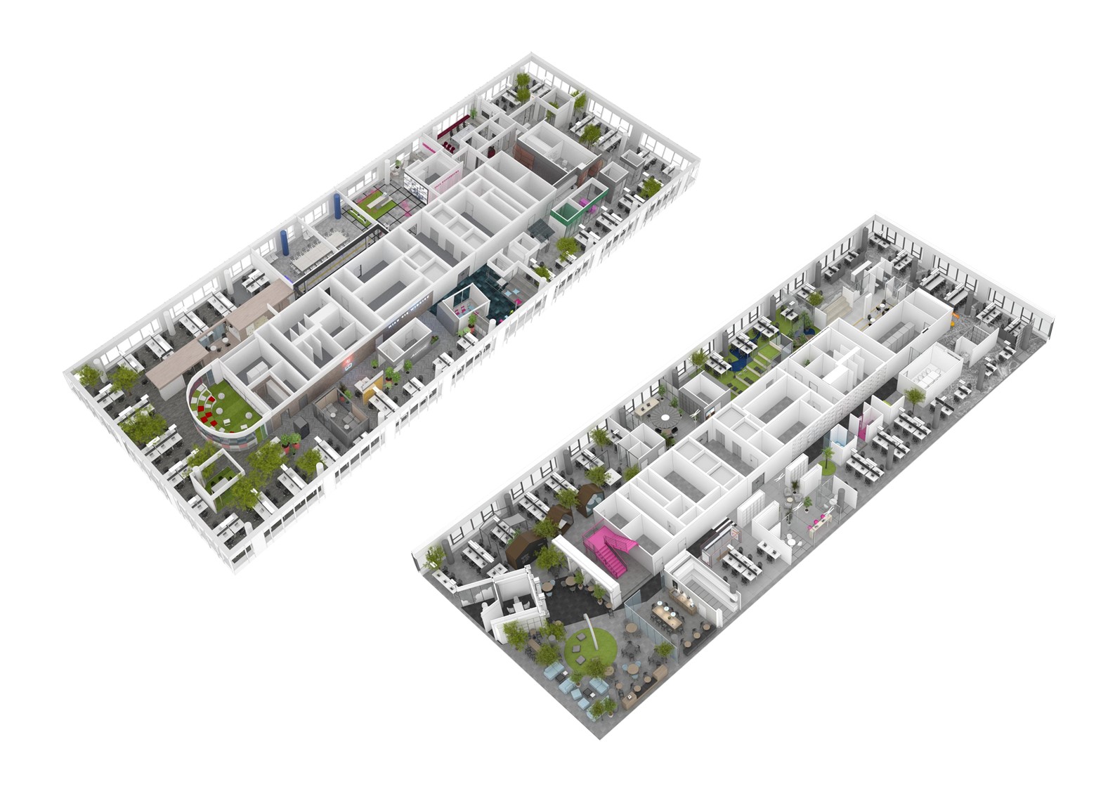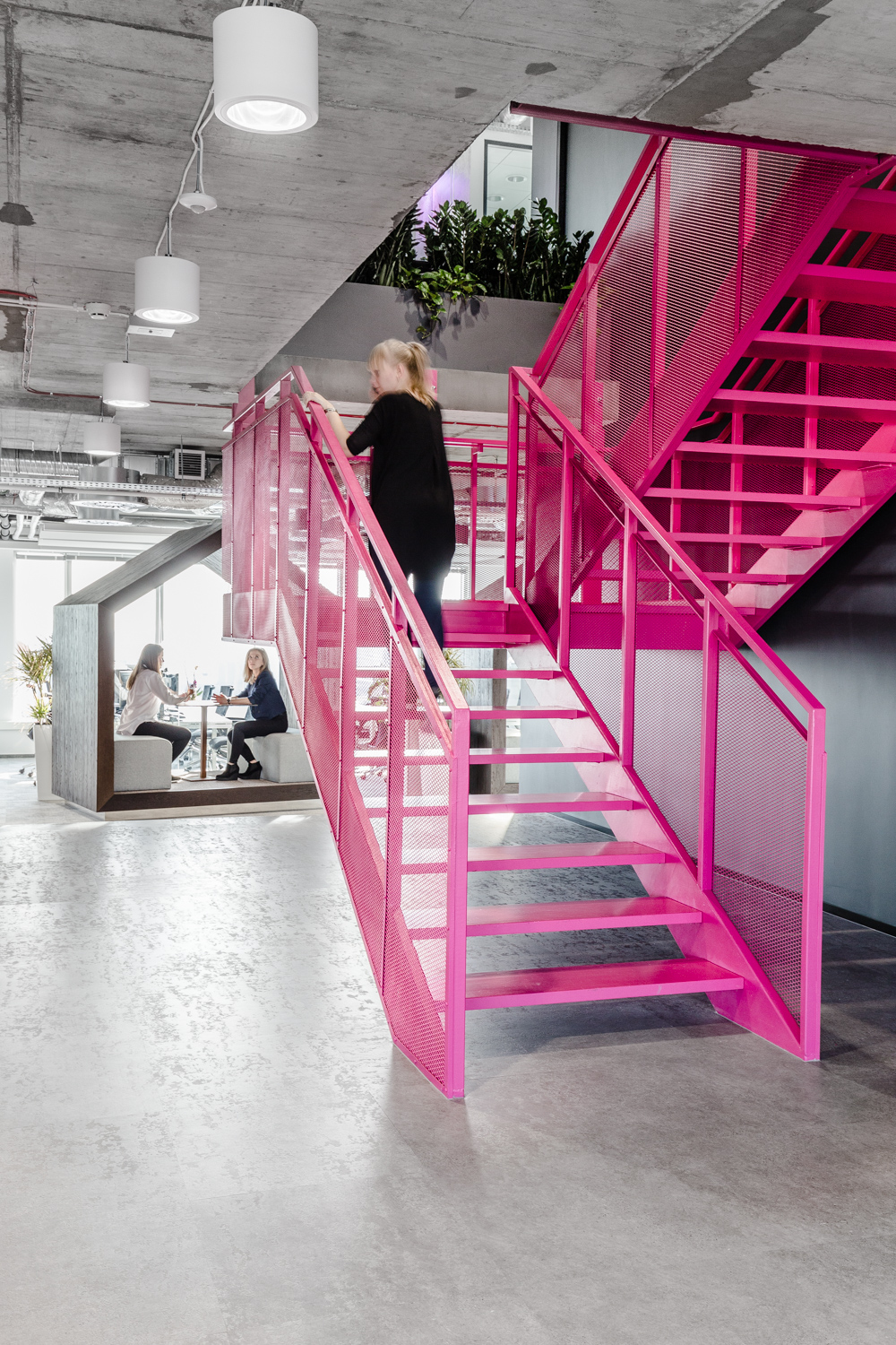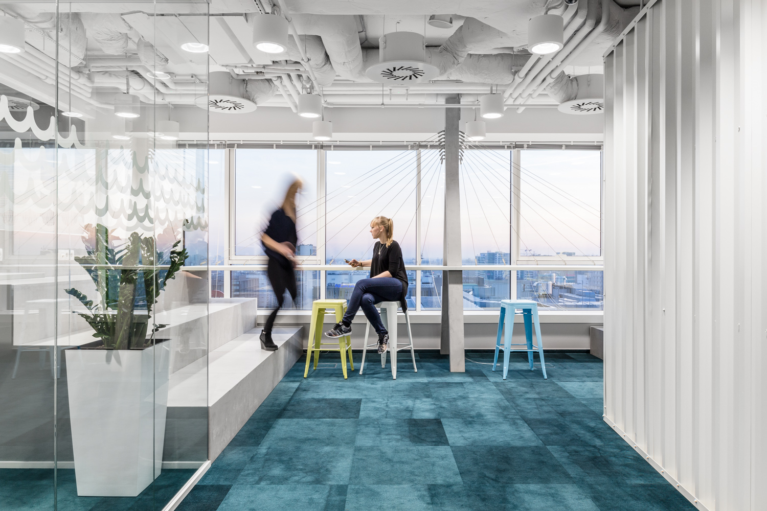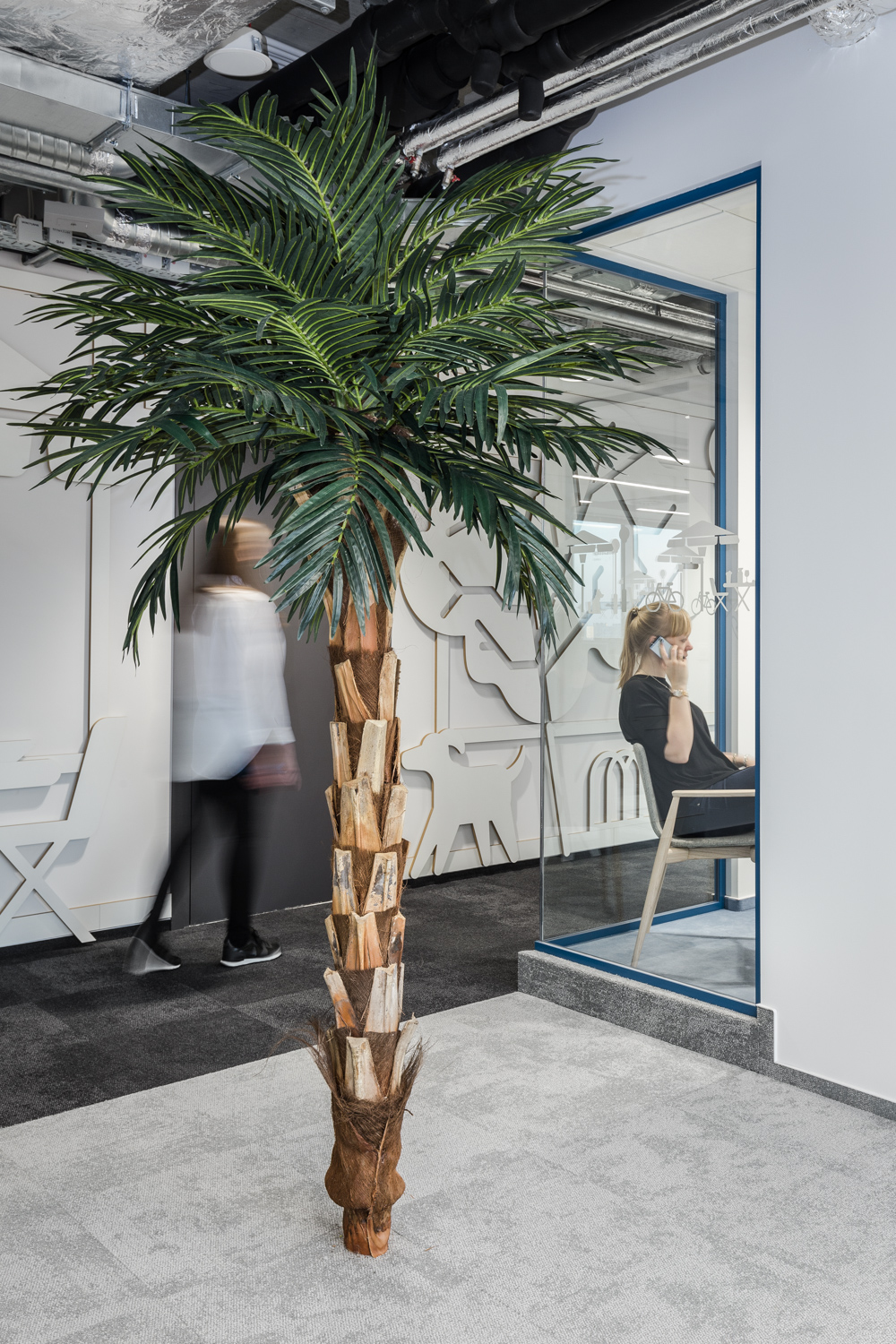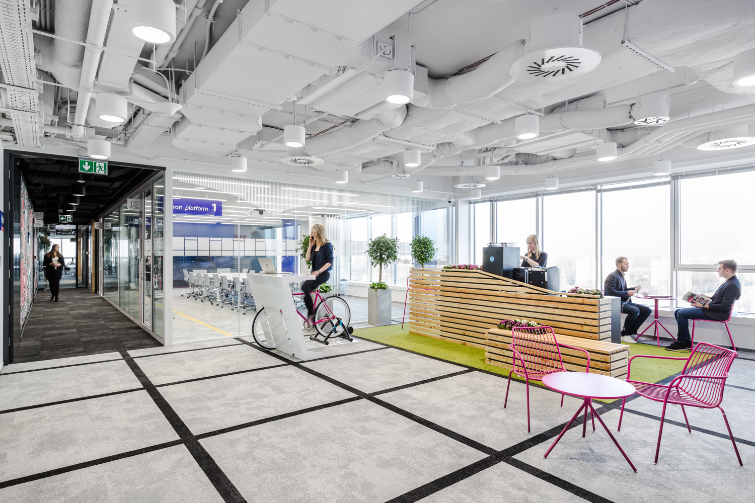 Na szczególną uwagę zasługuje rzadko spotykany w Polsce desk-sharing i space-sharing. W tak zaprojektowanym biurze biurko nie jest przypisane do pracownika, a wszelkie przestrzenie biurowe są współdzielone przez osoby zatrudnione w firmie. Jak obliczyli projektanci Workplace w większości firm w Polsce ze względu na to, że nieustannie prowadzone są spotkania z klientami, część osób pracuje zdalnie, część pozostaje na zwolnieniach lekarskich czy urlopach, efektywnie używanych jest zaledwie około 40% biurek. To średnia. W najlepszym przypadku 10% załogi jest poza biurem. Praktycznie nie zdarza się, aby wszyscy byli na stanowiskach.